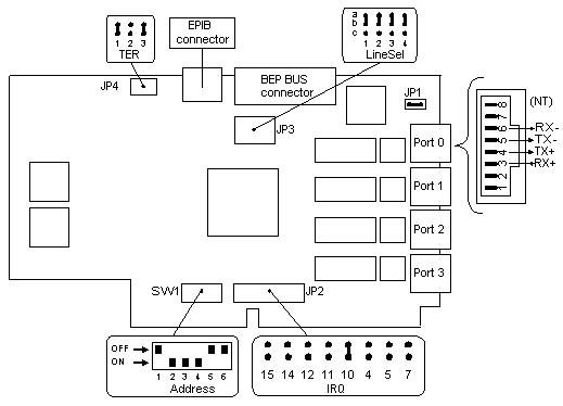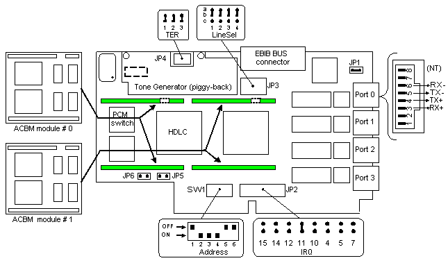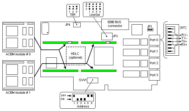 For correct jumpers/switches configuration, it also depends on the software one, refer to the chapter Ports numbering and adapters configuration.